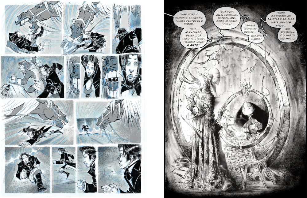 Arte de Bertho Horn (esq.) e J. M. Nicolosi (dir.) ilustram as duas metades que formam o projeto de contos de Poe em quadrinhos. Imagem/Reprodução