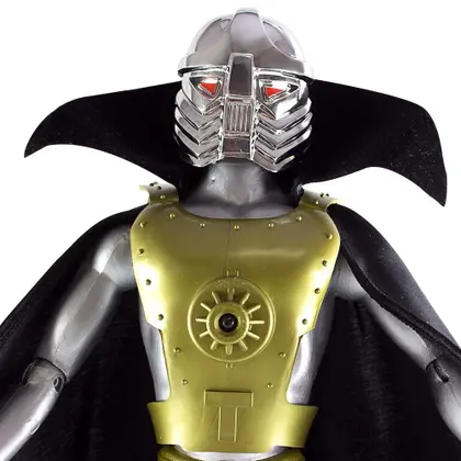 A nova versão colecionável é uma reprodução fiel, mas com upgrades modernos: o corpo mantém o tom cinza metálico e a cabeça cromada, mas agora é fabricado com materiais de alta resistência. O grande destaque continua sendo o colete dourado com luz de LED integrada, acompanhado de uma capa preta e acessórios futuristas que reforçam sua aura de ameaça intergaláctica.