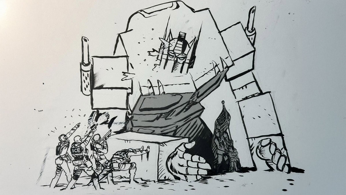 Uma ilustração recente de Daniel Warren Johnson, um dos nomes mais respeitados dos quadrinhos contemporâneos que colocou Optimus Prime no centro de um debate que ultrapassa o fandom e alcança o campo político. No desenho, o líder dos Autobots aparece ajoelhado, avariado, usando o próprio corpo como barreira para proteger pessoas ameaçadas por agentes do ICE (Immigration and Customs Enforcement), a polícia de imigração dos Estados Unidos.