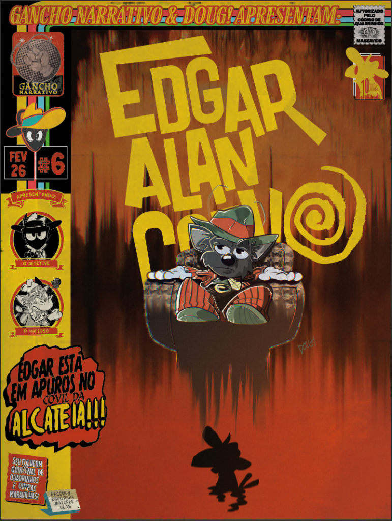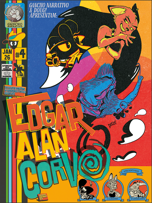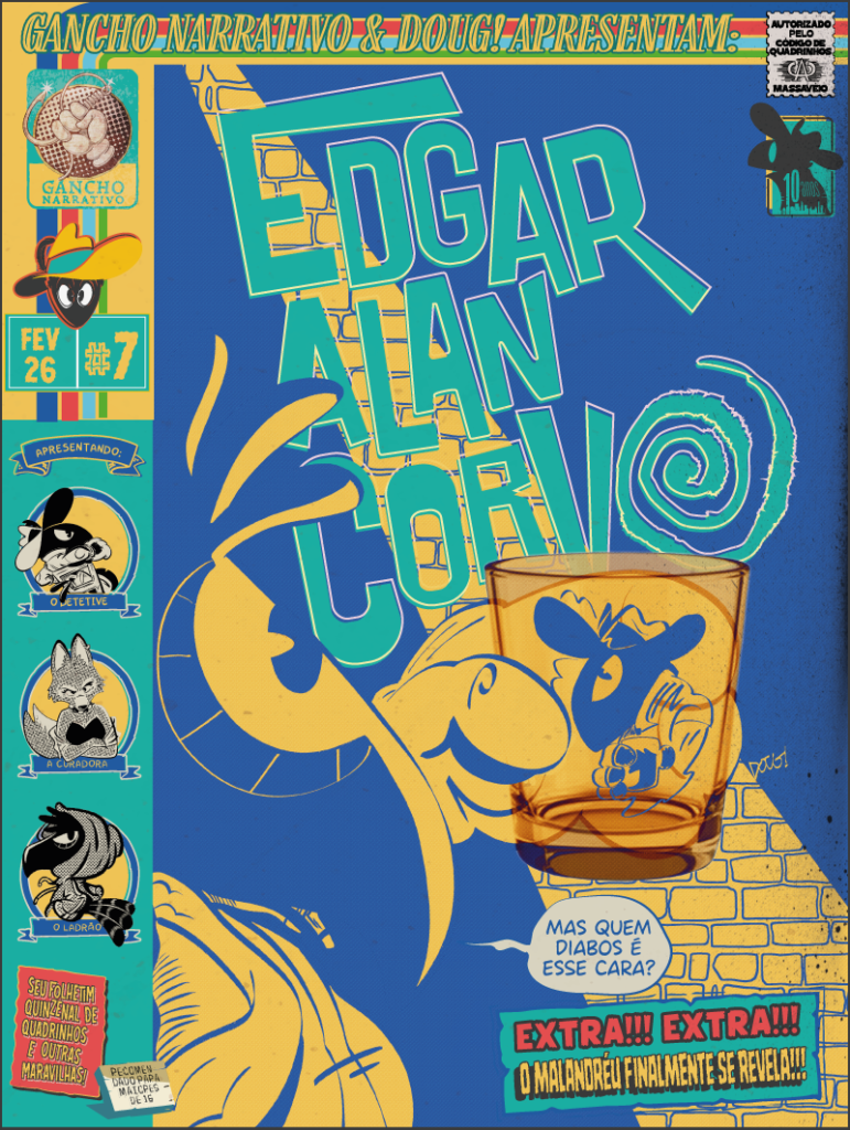 O selo Gancho Narrativo estreou oficialmente com a nova fase de Edgar Alan Corvo. Diferente da versão juvenil e cartunesca lançada na CCXP de 2015, a nova abordagem é inteiramente conduzida por seu criador, Doug!, roteirista experiente com passagens pela TV Globo e Turma da Mônica. A HQ será distribuída quinzenalmente no Substack, com capítulos de 10 páginas (uma por quinzena) que funcionam como contos fechados, permitindo que o leitor ingresse na narrativa a qualquer momento.