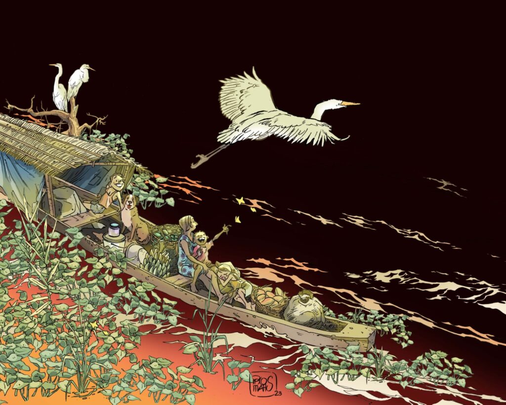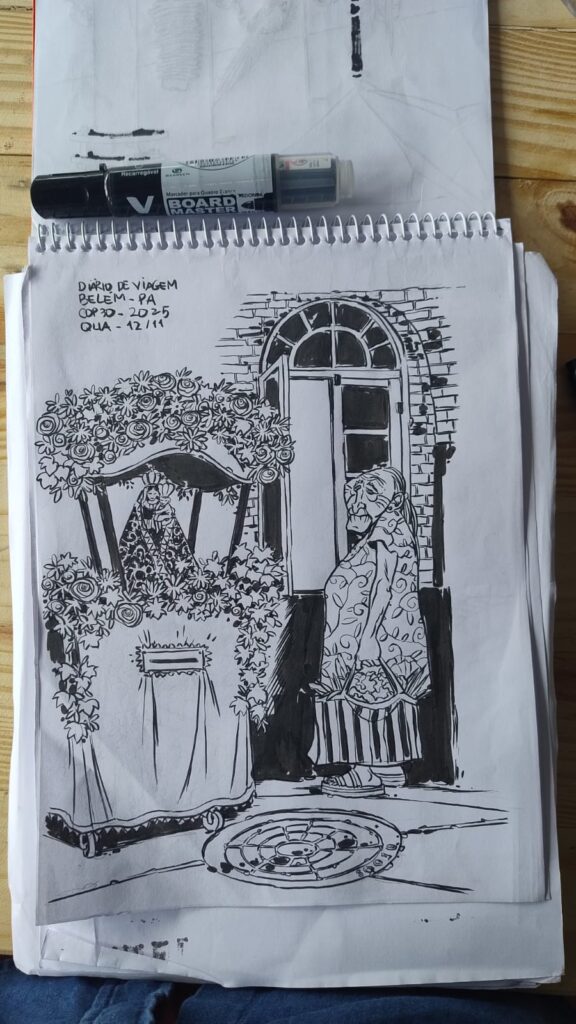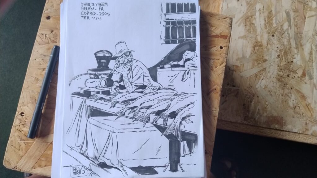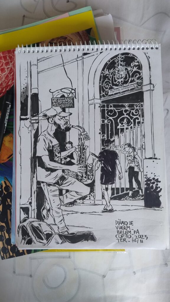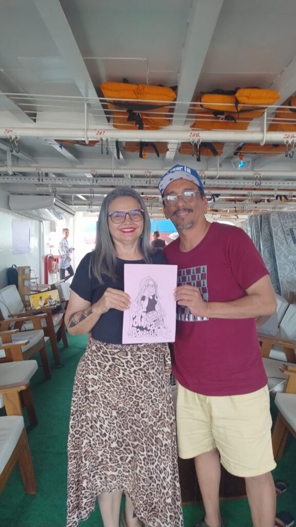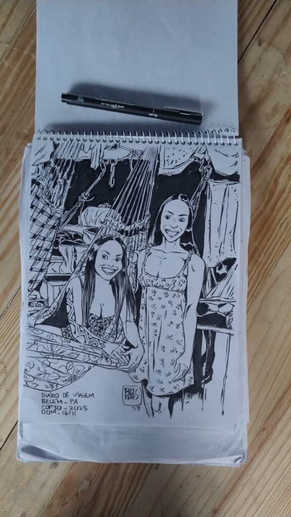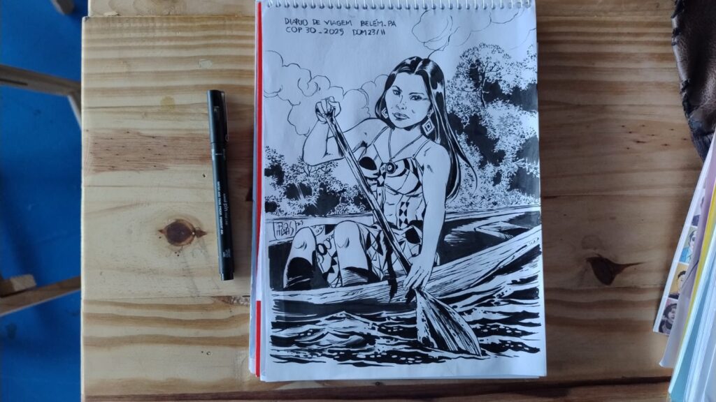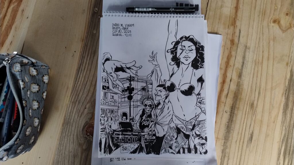 Romahs Mascarenhas: Eu não estava nesse universo da COP30, sabia? Onde os artistas estavam se conectando com o resto do Brasil e exterior. Eu viajei pra Belém num barco vendo rio, floresta, ribeirinhos, nossa fauna, nossa flora, no barco tinha lideranças quilombolas, indígenas, ribeirinhas e eu me reconectei com isso, nem percebia o quanto esse olhar pra dentro me fazia falta, eu escrevo sobre eles, desenho eles, mas não tinha percebido que me faltava estar mais lá, pisando no mesmo chão e vendo de pertinho o que nos chega nas notícias dos portais, nos documentários. Acabei focando nisso, sendo engolido por isso, entrei mais no norte em vez de sair. Mas, fico esperançoso que tanta gente vindo em Belém e ver a nossa cultura tão rica e bonita saia daqui levando um pouco dela como pólen em suas roupas e bagagens.