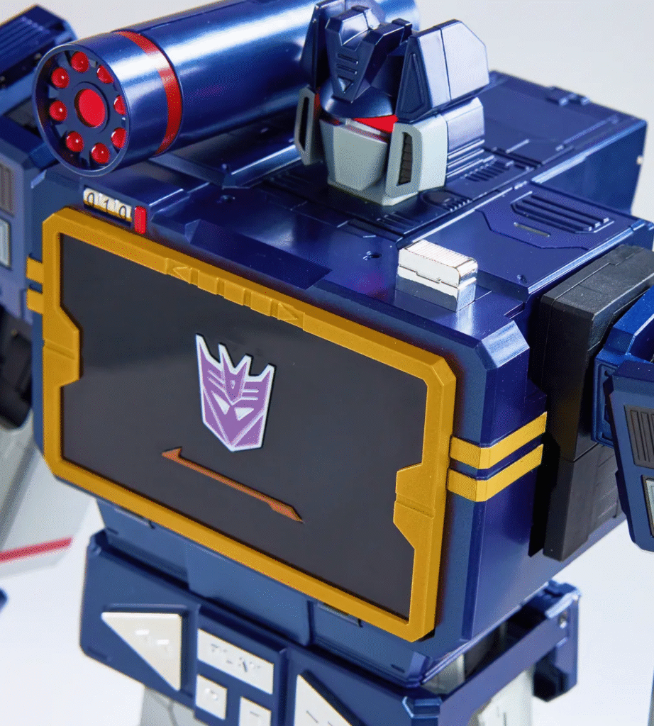 A Robosen elevou o nível da imersão. Quando transformado, o Soundwave funciona como um alto-falante Bluetooth real. Você pode conectar seu celular e transmitir suas músicas favoritas diretamente pelo Decepticon. E o detalhe que vai explodir a mente dos fãs: os botões retrô no peito do robô são funcionais; você pode dar play, pause e pular faixas pressionando o próprio dispositivo.